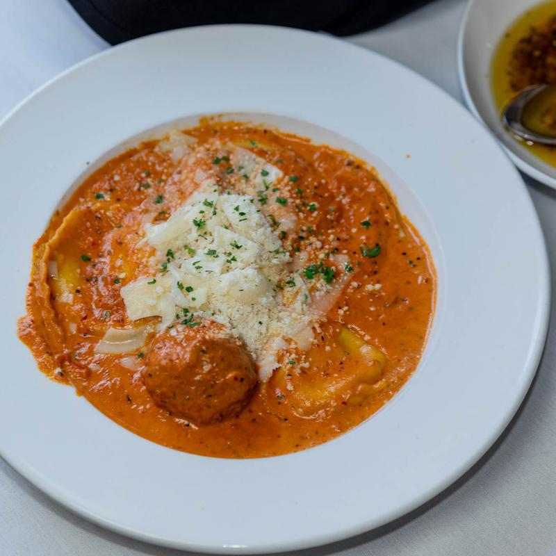 Cheese-stuffed ravioli served in vodka sauce with a meatball.