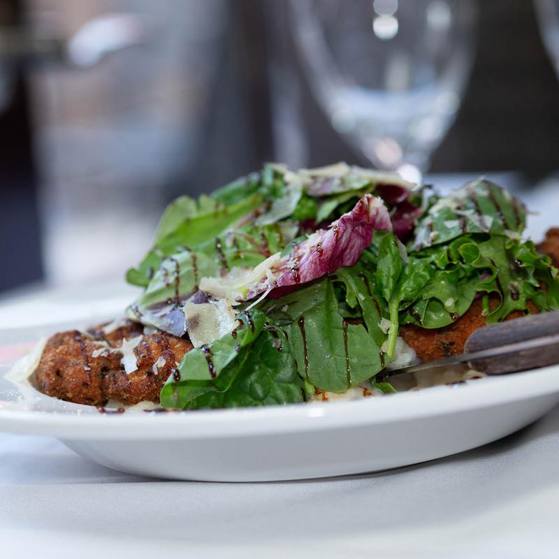 Deep-fried chicken served over parmesan risotto, topped with spring mix and bruschetta, then a balsamic glaze drizzle.