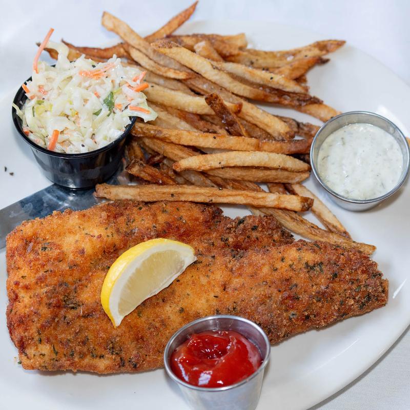 Fresh haddock served fried or broiled with coleslaw, tartar sauce, and fries.
