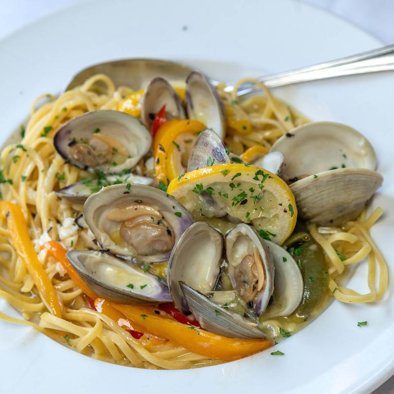 Fresh whole clams steamed in our white wine and lemon sauce, served over linguini with peppers.